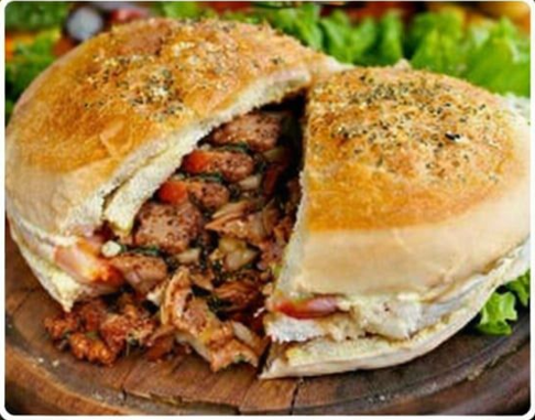 Pão diferenciado, filé de carne, frango desfiado, coração de galinha, calabresa, bacon crocante, queijo derretido com orégano, alface, tomate fresco, milho e ervilha. Finalizado com maionese da casa, ketchup e mostarda.